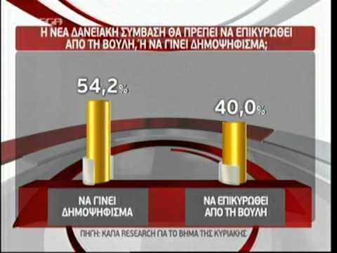 Το 54,2%, απαντώντας σε σχετική ερώτηση λέει ότι θέλει δημοψήφισμα για τη νέα δανειακή σύμβαση ενώ το 40% απαντά ότι θέλει να ψηφιστεί μόνο από τη Βουλή. Ως προς το τι θα ψήφιζαν, το 45,5% αναφέρουν ότι θα ψήφιζαν αρνητικά στο δημοψήφισμα και το 35,2% θα ψήφιζε υπέρ. Ένα 7,5% λένε ότι δεν θα συμμετείχαν..